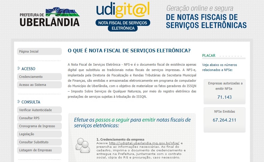 O prestador de serviços conta com mais uma facilidade em Uberlândia: antes feito presencialmente, o cadastro para emissão da Nota Fiscal de Serviços Eletrônica (NFS-e) agora está disponível on-line, por meio do Portal da Prefeitura. O recurso se junta a uma série de serviços públicos oferecidos digitalmente pelo Município para melhorar ainda mais o atendimento da população. Ao entrar no endereço www.uberlandia.mg.gov.br, a ferramenta “Udigital” está acessível dentro do menu “Serviços”, localizado na parte superior do site (acesse aqui).
