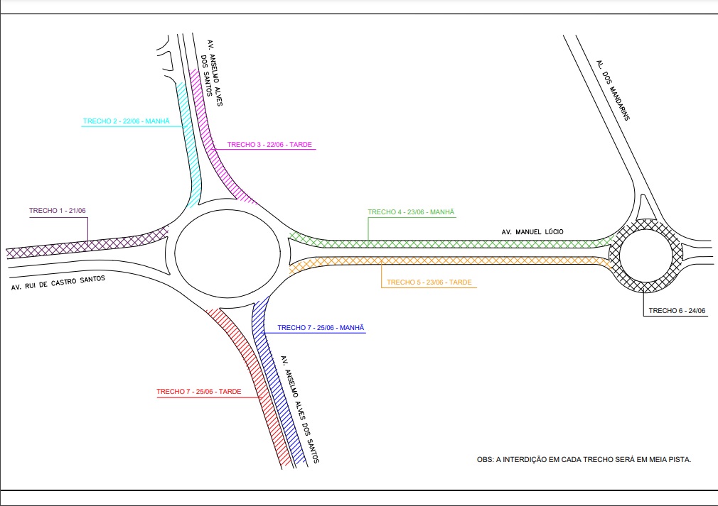 A Secretaria Municipal de Trânsito e Transportes (Settran) informa que interditará parcialmente, a partir desta segunda-feira (21) até a próxima sexta-feira (25), das 7h às 17h, a avenida Anselmo Alves dos Santos, próximo as avenidas Rui de Castro Santos e Manuel Lúcio, no bairro Grand Ville. A interdição é necessária para reforçar a sinalização viária do local. As avenidas Rui de Castro Santos e Manuel Lúcio também receberão o serviço.