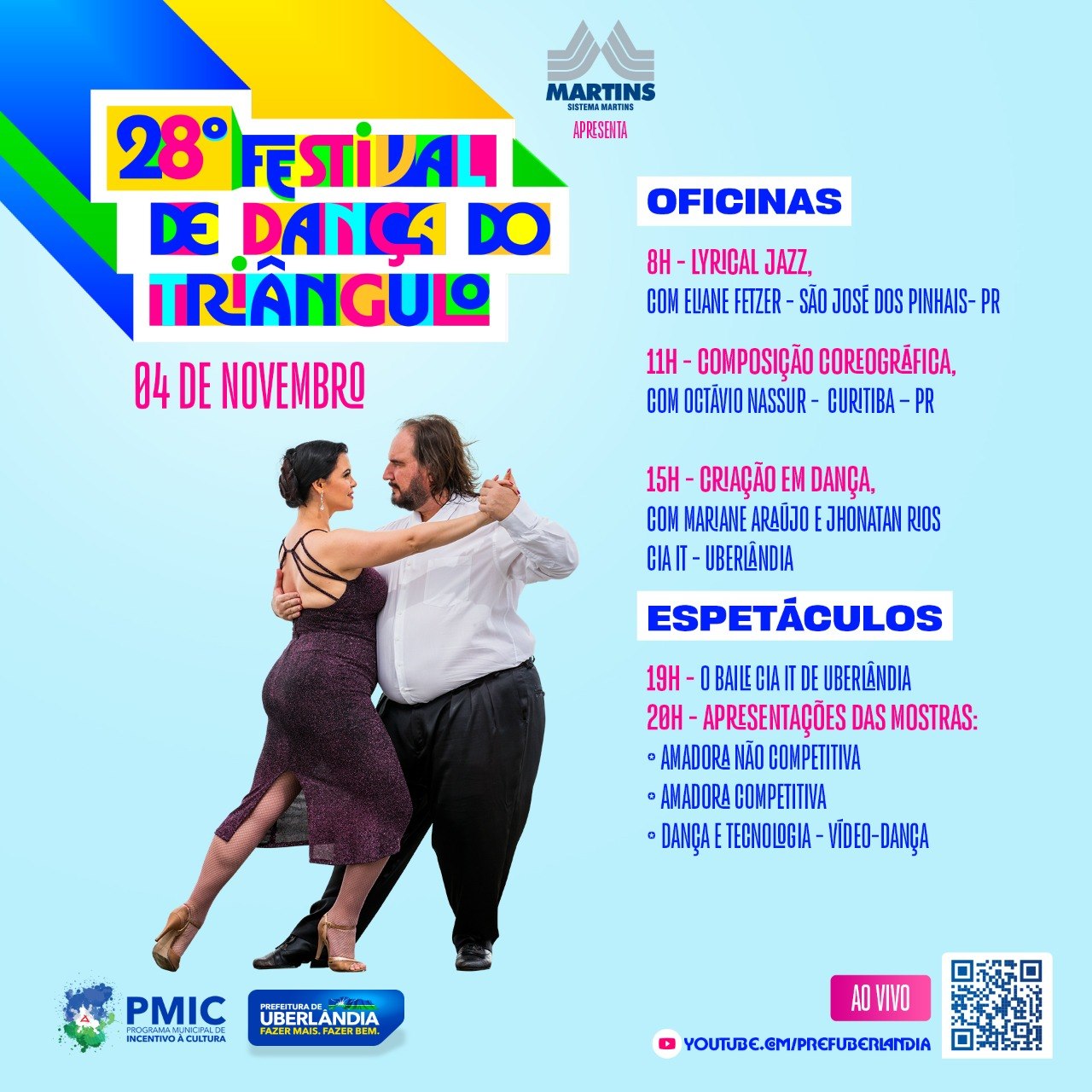 A programação de oficinas gratuitas do 28º Festival de Dança do Triângulo continua nesta quinta-feira (4). Para participar, basta acessar a plataforma Via Zoom, conforme o link e os dados de acesso que estão junto do cronograma.