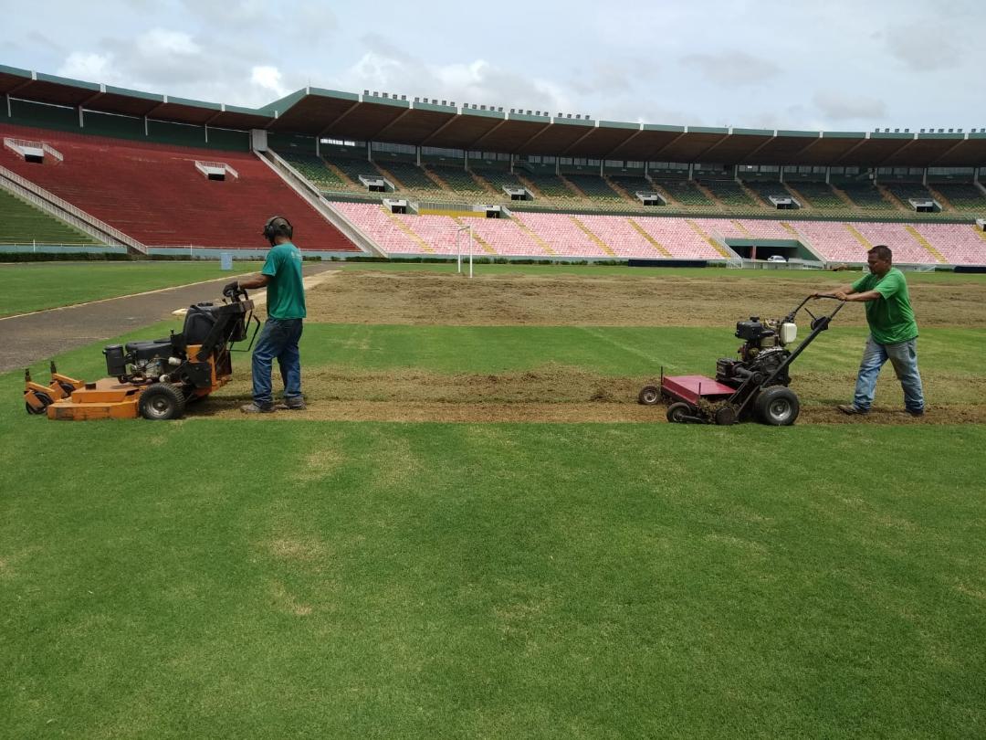 Na primeira etapa de serviço, está sendo feito o corte vertical, rente ao chão, e aeração do solo (perfuração do solo e remoção do gramado para permitir que o ar, a água e os nutrientes penetrem e cheguem às raízes). Já na segunda fase, será feita a descompactação, adubação do gramado e nivelação de algumas partes com areia, para que o gramado fique saudável e bonito.