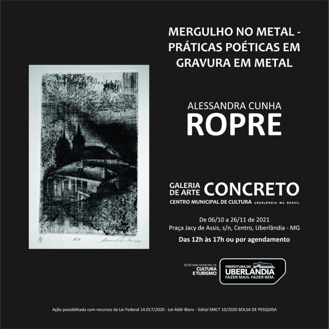 A exposição “Mergulho no Metal” fomentada pela Lei Federal Aldir Blanc e incentivada pela Secretaria Municipal de Cultura e Turismo da Prefeitura de Uberlândia, chega ao público com uma série de 30 matrizes de gravura em metal, demonstrando a realidade vivida pela artista que engajou uma poética que aborda o contemporâneo, o social em meio ao período pandêmico.   O trabalho expõe também os potenciais de impressão, o estudo profundo desta técnica e a experimentação de cores e texturas.