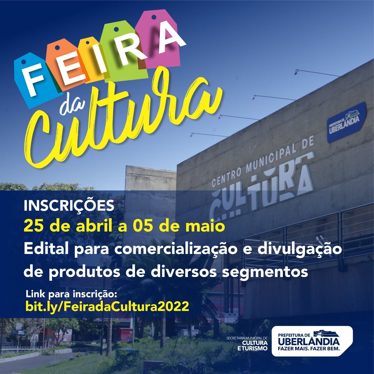A Secretaria Municipal de Cultura e Turismo da Prefeitura de Uberlândia divulgou, no Diário Oficial do Município, o edital para as próximas edições da Feira de Cultura. As inscrições acontecerão entre os dias 25 de abril e 5 de maio. A segunda edição da Feira de Cultura ocorrerá nos dias 8 e 9 de julho, das 17h às 22h, e reunirá diversos expositores no Centro Municipal de Cultura (CMC).