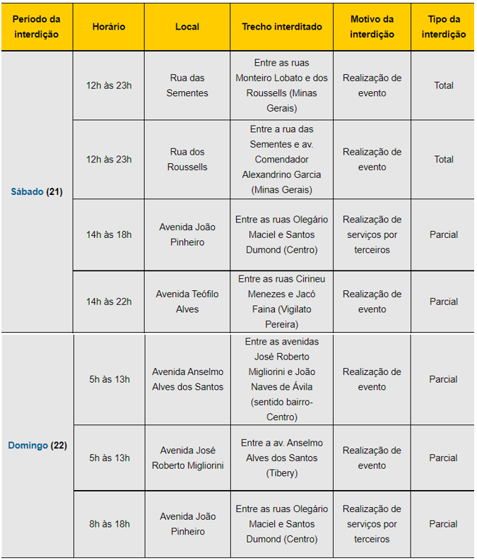 A Secretaria Municipal de Trânsito e Transportes (Settran) informa que, neste sábado (21) e domingo (22), trechos de vias dos bairros Minas Gerais, Centro, Vigilato Pereira e Tiberyestarão interditados para realização de eventos e serviços. Deste modo, motoristas devem trafegar com atenção nas proximidades dos trechos em que o trânsito será desviado.