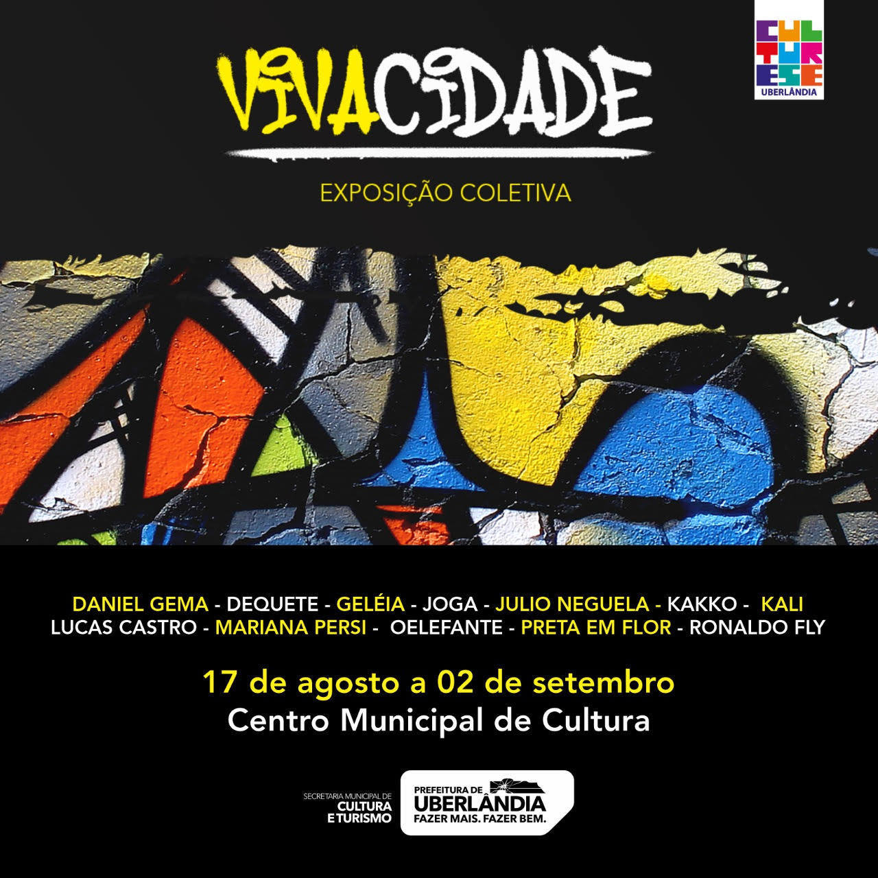 A exposição “VIVAcidade” continua até 2 de setembro no Centro Municipal de Cultura. A mostra faz parte do projeto “Ruas que falam” e destaca o trabalho de grafitagem em telas, desenvolvido por artistas locais. O projeto, que é estimulado pela Secretaria Municipal de Cultura e Turismo, foi um dos selecionados da edição 2021 do Programa Municipal de Incentivo à Cultura (Pmic).