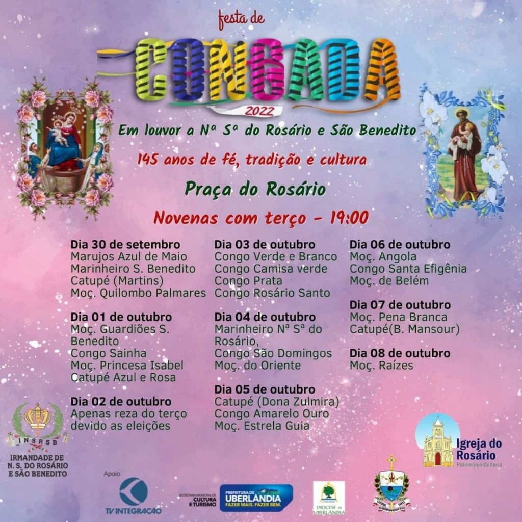 Para encerrar as celebrações do Congado 2022 e comemorar os 145 anos de Congada no município, a Prefeitura de Uberlândia, por meio da Secretaria Municipal de Cultura e Turismo, apoia e divulga a tradicional Festa de Congada que acontece neste domingo (9) e segunda-feira (10) com cortejos que seguirão até à Igreja do Rosário (veja abaixo).
