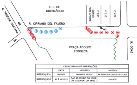 A Secretaria Municipal de Trânsito e Transportes (Settran) informa que realizará interdição total em alguns trechos no bairro Fundinho para realização de evento por terceiros. A montagem da estrutura será realizada nesta sexta-feira (16), das 8h às 18h, na rua Cipriano Del Fávero, entre as ruas Teixeira Santana e Goiás. Para o evento em si, a interdição será das 18h do dia 16/12 à meia-noite do dia 18/12. Os motoristas devem trafegar com atenção nas proximidades.