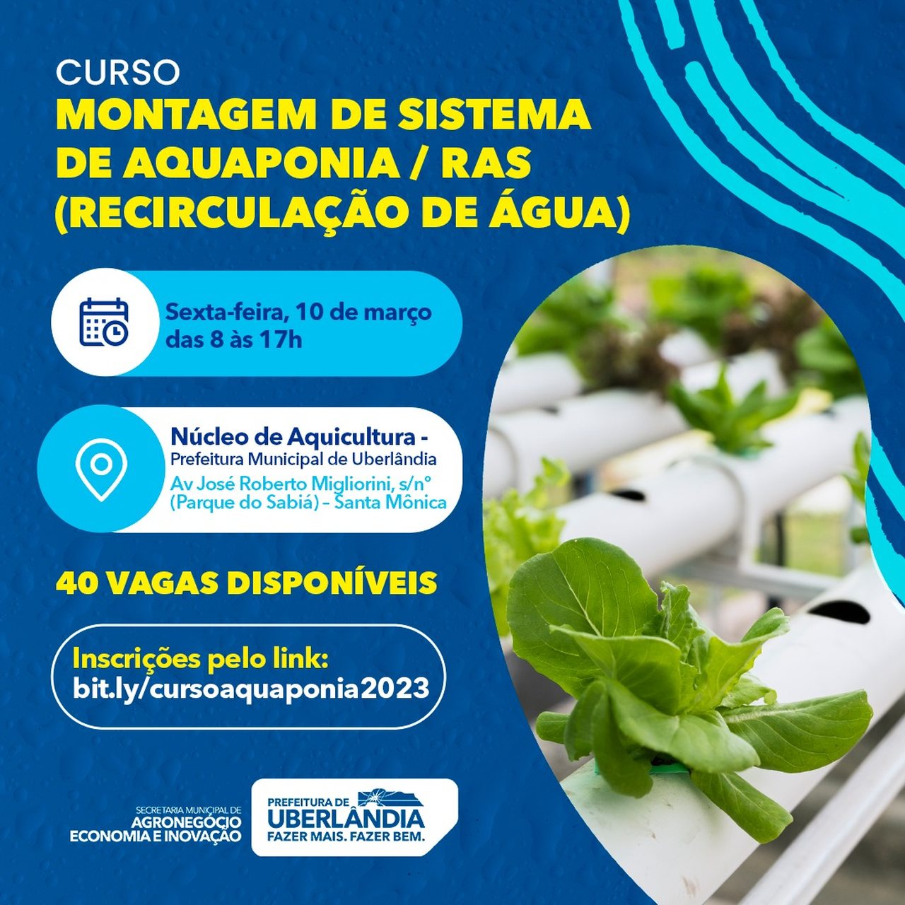 A Secretaria Municipal de Agronegócio, Economia e Inovação (SMAEI) vai promover, no dia 10 de março, a capacitação “Montagem de Sistema de Aquaponia (RAS – Recirculação de Água)”. São 40 vagas para o treinamento, que é gratuito. As inscrições estão abertas e devem ser feitas por meio de formulário online. (Clique aqui e inscreva–se)