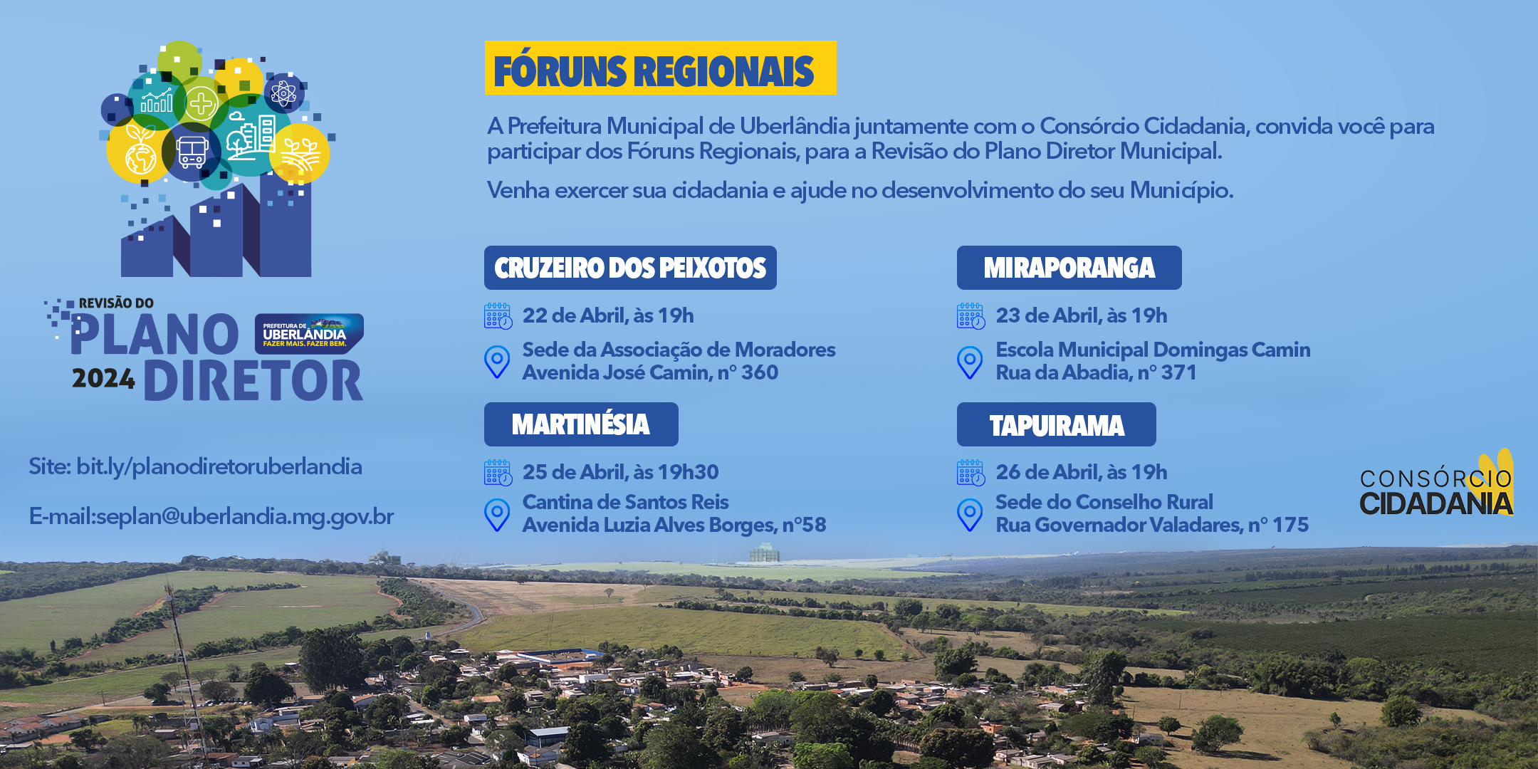 A Prefeitura de Uberlândia, por meio da Secretaria Municipal de Planejamento Urbano (Seplan), inicia, nesta segunda-feira (22), mais uma etapa da elaboração do novo Plano Diretor de Uberlândia com a chegada dos fóruns regionais de participação pública aos distritos locais. Às 19h, o encontro ocorrerá no distrito de Cruzeiro dos Peixotos, na sede da Associação de Moradores, na avenida José Camin, nº 360.