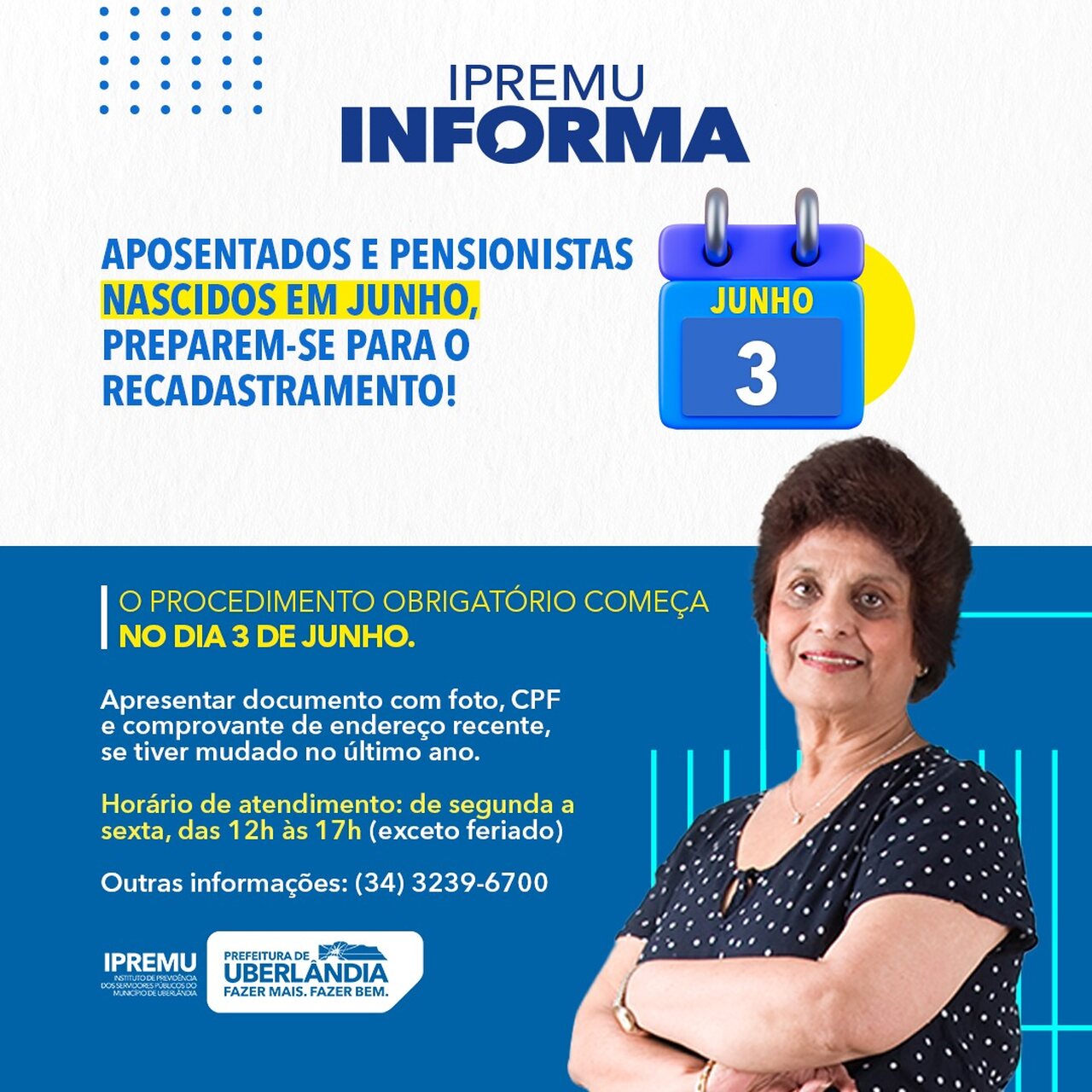 Aposentados e pensionistas nascidos em junho poderão comparecer, a partir da próxima segunda-feira (3), para o recadastramento anual obrigatório realizado pelo Instituto de Previdência dos Servidores Públicos do Município de Uberlândia (Ipremu). O procedimento também é conhecido como prova de vida.
