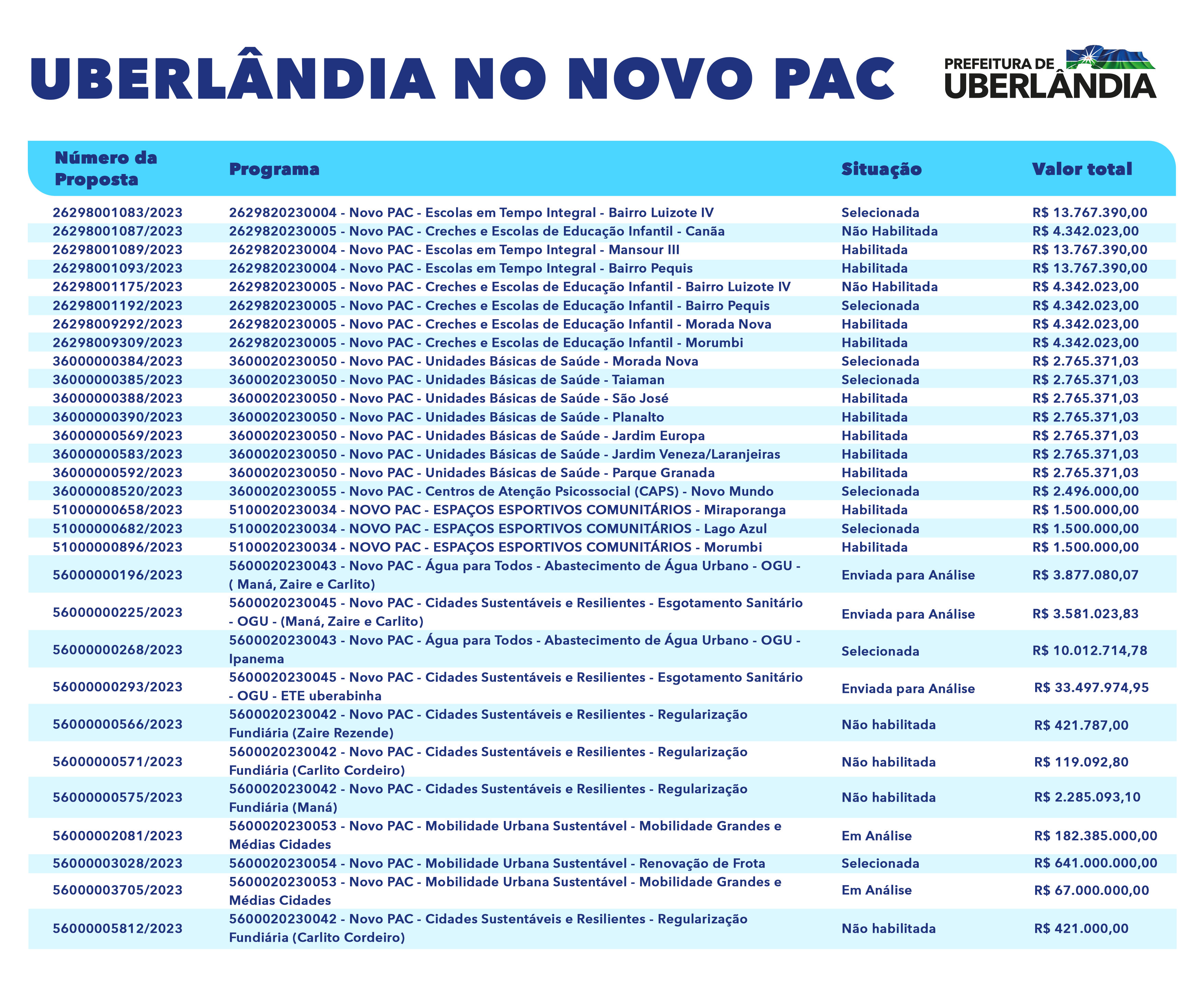 Confira a seguir os outros projetos da Prefeitura de Uberlândia já selecionados pelo Governo Federal e que aguardam liberação de recursos ou financiamento para serem executados: