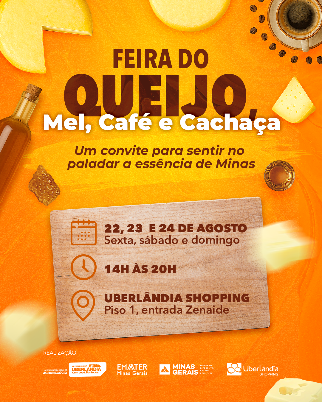 A Prefeitura de Uberlândia, por meio da Secretaria Municipal de Agronegócio, em parceria com a Empresa de Assistência Técnica e Extensão Rural de Minas Gerais (Emater-MG) e com o Uberlândia Shopping, está com edital aberto para Chamamento Público destinado à realização do evento Feira do Queijo, Mel, Café e Cachaça – Edição 2025. O evento será realizado no Uberlândia Shopping (Piso I), entre os dias 22 e 24 de agosto, das 14h às 20h. Os interessados em participar deverão preencher o formulário eletrônico até as 12h da próxima segunda-feira (18). (Acesse aqui o edital)