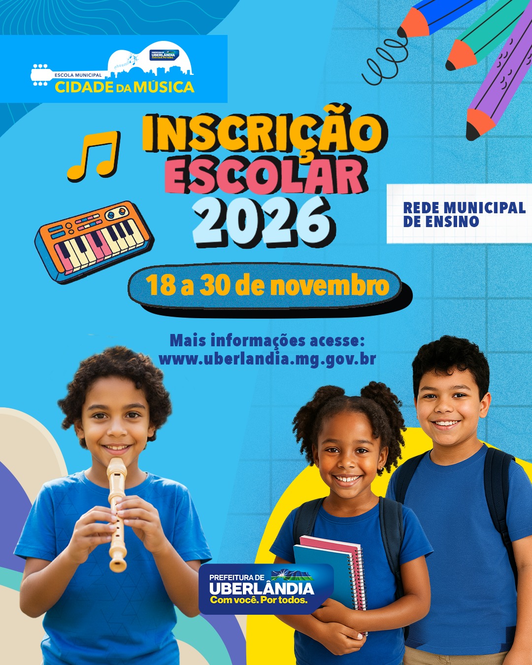 A Secretaria Municipal de Educação também realizará as inscrições para a Escola Cidade da Música no mesmo período. O procedimento também será feito no Portal da Prefeitura de Uberlândia, pelo endereço eletrônico www.uberlandia.mg.gov.br, no link Inscrição Escolar. Serão oferecidas vagas nos cursos de Canto Coral infantojuvenil e adulto, Teatro, Dança-teatro, Desenho, Musicalização Infantil, Flauta Doce, Guitarra, Viola Caipira, Violão, Percussão e Teclado.