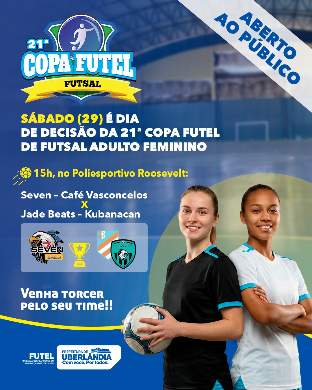 A Prefeitura de Uberlândia, por meio da Fundação Uberlandense do Turismo, Esporte e Lazer (Futel), promove, neste sábado (29), a decisão da 21ª Copa Futel de Futsal Adulto Feminino, entre Seven – Café Vasconcelos e Jade Beats – Kubanacan. O jogo é aberto ao público e acontece no Poliesportivo Roosevelt, às 15h.