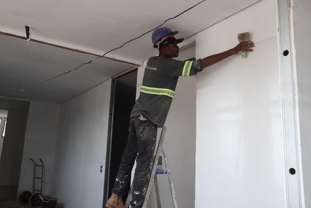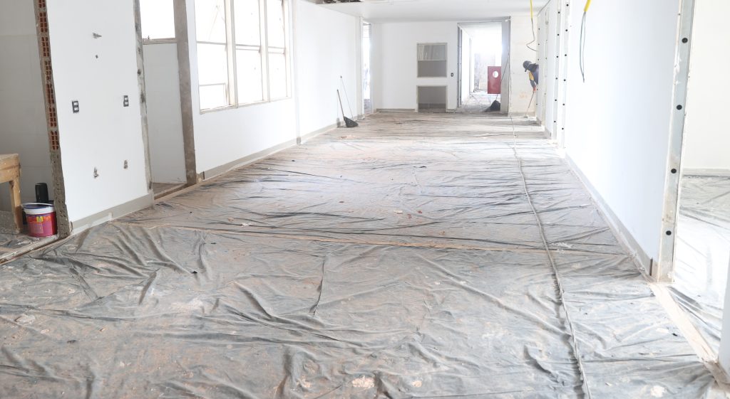 Na fase atual estão sendo executadas as etapas de revestimento, acabamento e instalações hidrossanitárias e elétricas. Até o momento, já foram realizados: limpeza do terreno, demolição de drywall e de pisos, retirada de argamassa, execução de alvenaria e início das instalações hidráulicas.