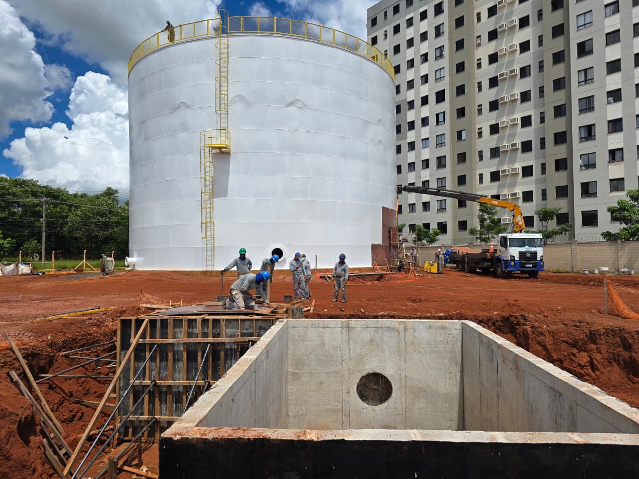 Atualmente, a pintura interna e externa do reservatório, que terá capacidade de armazenar 6 mil m³ (seis milhões de litros) de água, está em fase final de execução, etapa que antecede os testes operacionais. Também teve início a montagem das curvas e tubulações que irão compor o arranjo hidráulico do sistema, fundamentais para o funcionamento adequado da estrutura.