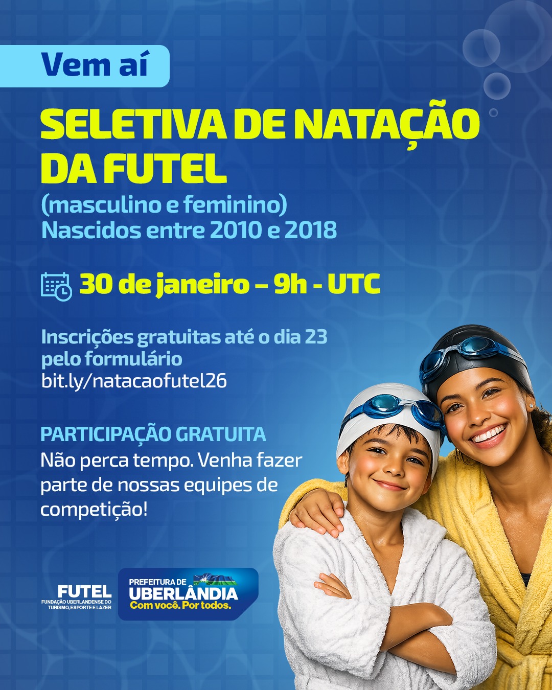 Termina nesta sexta (23), o prazo de inscrição para participar da seletiva gratuita de natação promovida pela Prefeitura de Uberlândia, com o objetivo de compor a equipe de competição da Fundação Uberlandense do Turismo, Esporte e Lazer (Futel) em 2026. A avaliação gratuita é voltada a crianças e adolescentes nascidos entre 2010 e 2018, tanto no masculino quanto no feminino. Para participar, o interessado precisa saber nadar nos quatro estilos (borboleta, costas, peito e crawl) e deve preencher, com a ajuda de um responsável, o formulário online (clique aqui para acessar o formulário de inscrição).