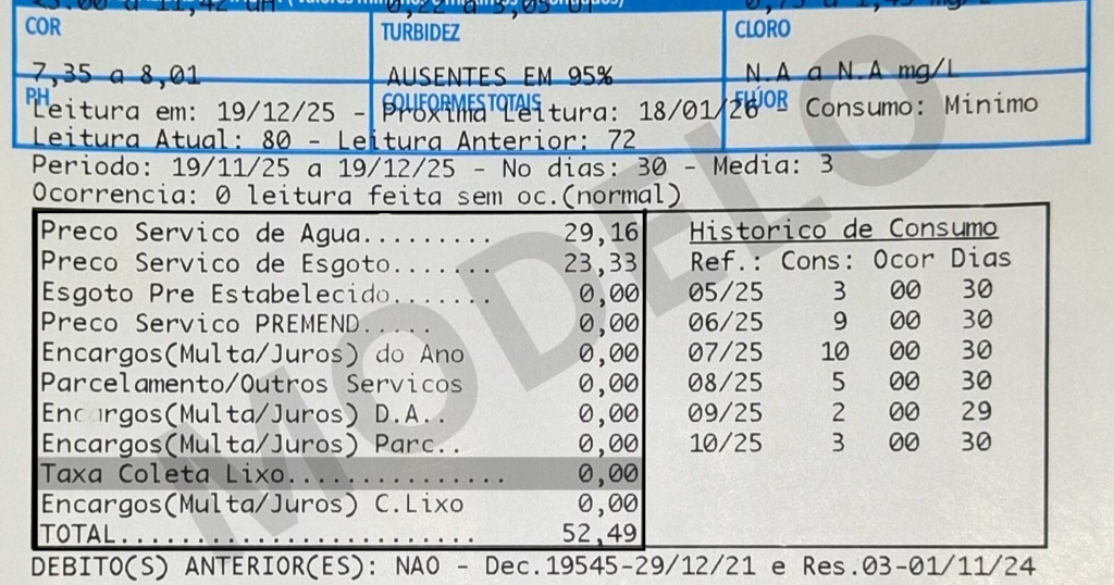 A cobrança da taxa em 2026 já começou a ser realizada, tanto nas faturas de conta de água do mês de janeiro, quanto por meio dos carnês que já foram enviados pelos Correios.