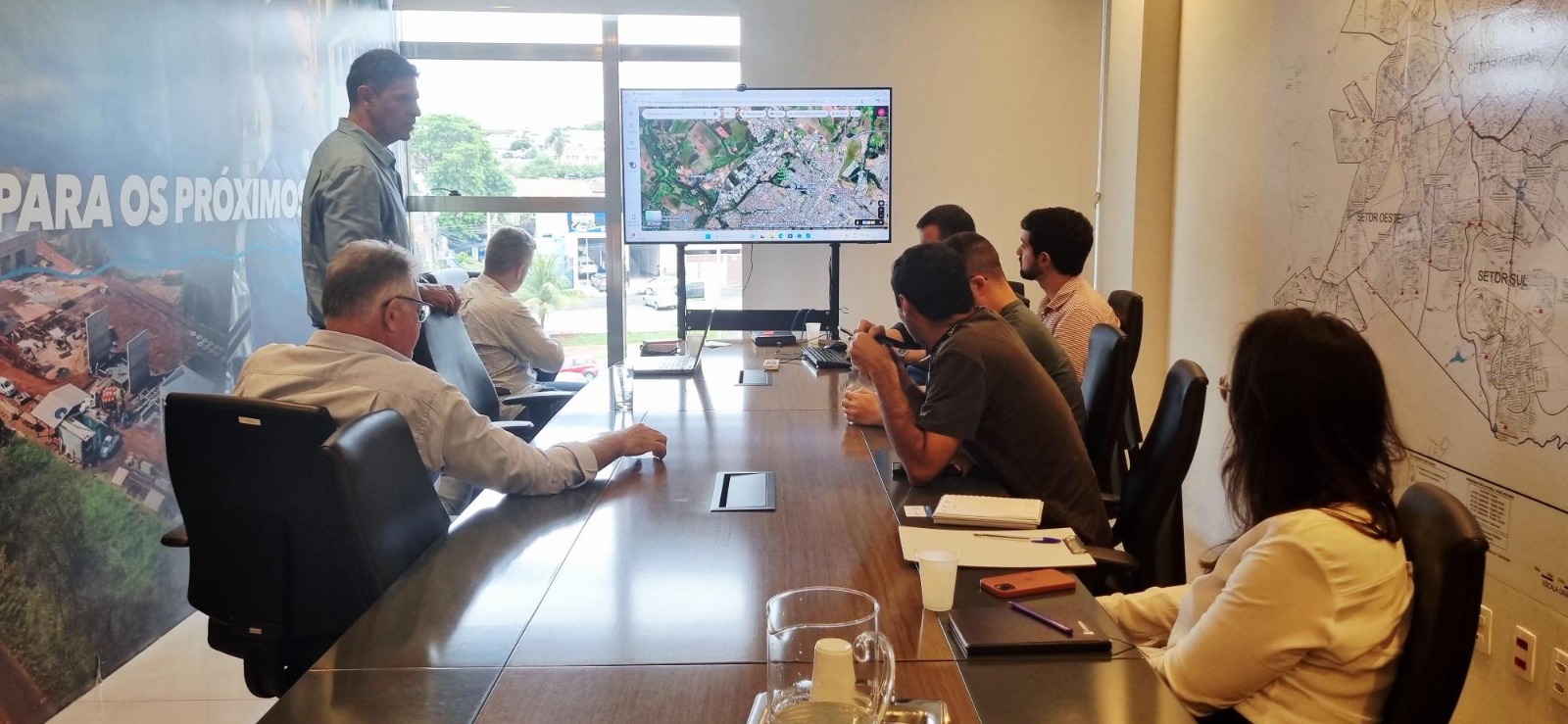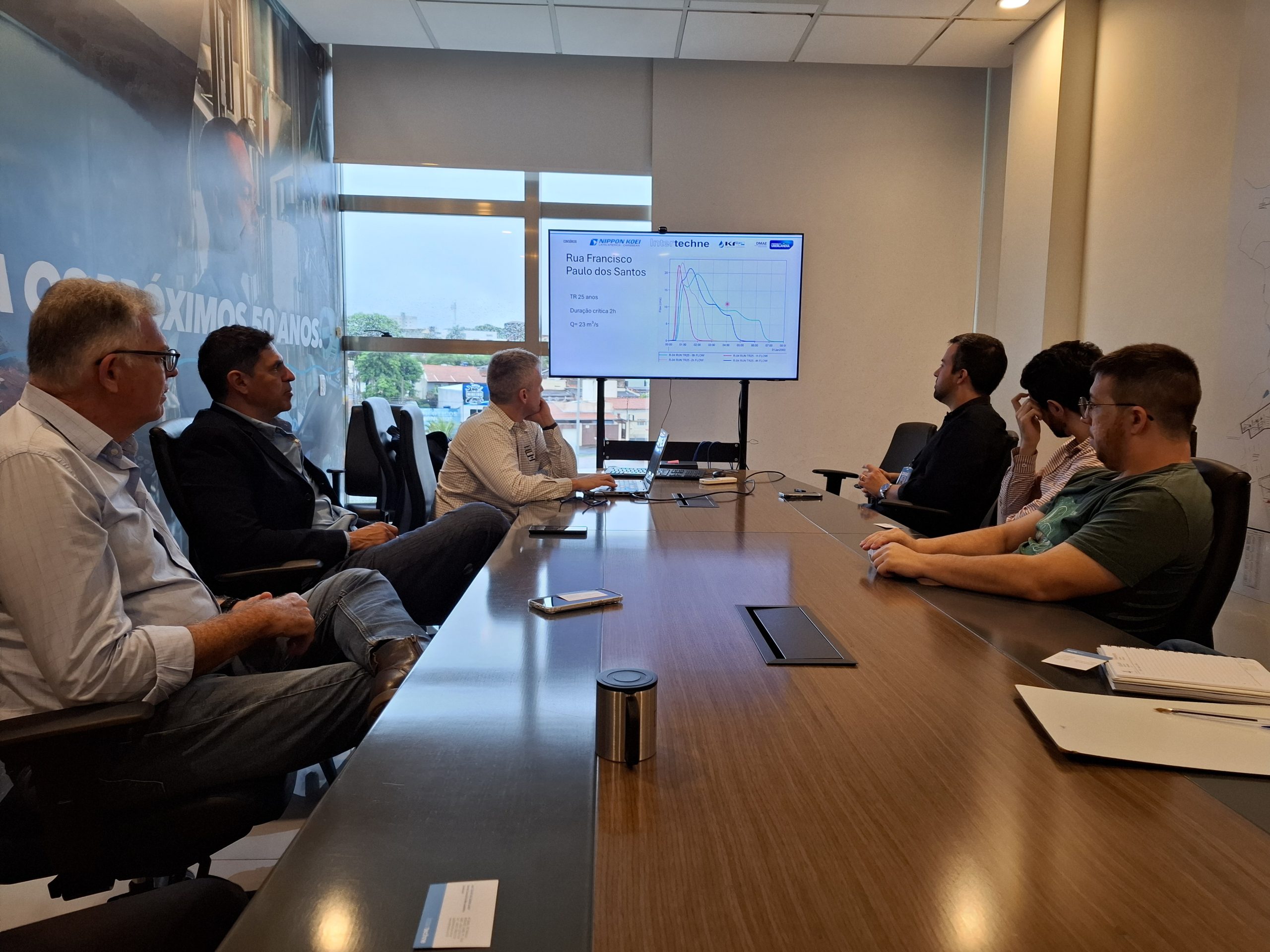.O Departamento Municipal de Água e Esgoto (Dmae) realizou, na manhã desta quarta-feira (4), uma reunião técnica com a empresa Intertechne, integrante do consórcio responsável pela elaboração do Plano Diretor de Drenagem e Manejo de Águas Pluviais Urbanas e Projetos Básicos de Uberlândia. Durante o encontro, foi apresentado um modelo hidrológico do Córrego do Óleo, que irá subsidiar as etapas de elaboração do Plano Diretor de Drenagem e Manejo. O modelo ainda se encontra em fase de calibração, com ajustes relacionados ao uso e ocupação do solo e ao cadastro da bacia, incluindo o levantamento atualizado do Córrego do Óleo, atualmente em andamento.