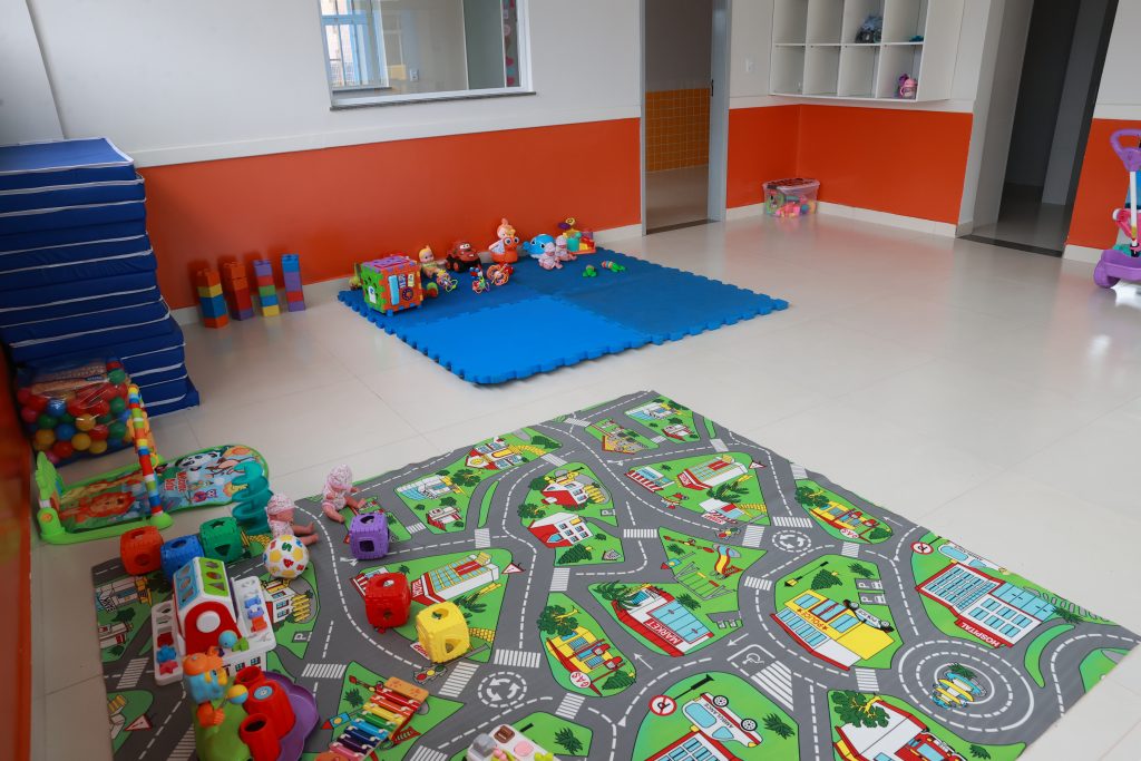 · Bloco A: hall, secretaria, cinco áreas de circulação, sala de professores, sala de direção, almoxarifado, dois banheiros acessíveis para adultos (masculino e feminino), área de higienização, lactário, dois fraldários, dois depósitos, área de amamentação, duas salas de atividades – Creche I, dois solários, área SI/Telefonia/Elétrica, copa para funcionários, lavanderia, rouparia, depósito de materiais de limpeza, dois vestiários, banheiro PCD infantil, refeitório, cozinha, dispensa, varanda de serviço e varanda;