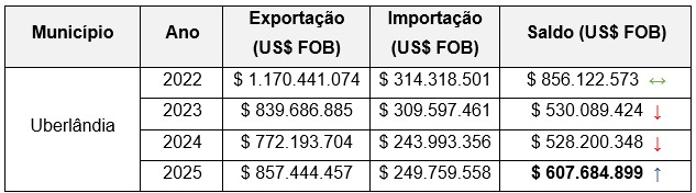 Uberlândia voltou a apresentar crescimento na balança comercial ao apresentar saldo superior a US$ 607,68 milhões, ao longo do ano passado. O dado, do Ministério do Desenvolvimento, Indústria, Comércio e Serviços, reforça que o município obteve superávit em 2025 na comparação com os dois últimos anos, que tiveram tendência de queda, com diferença para o ano anterior, por exemplo, de US$ 79,48 milhões.