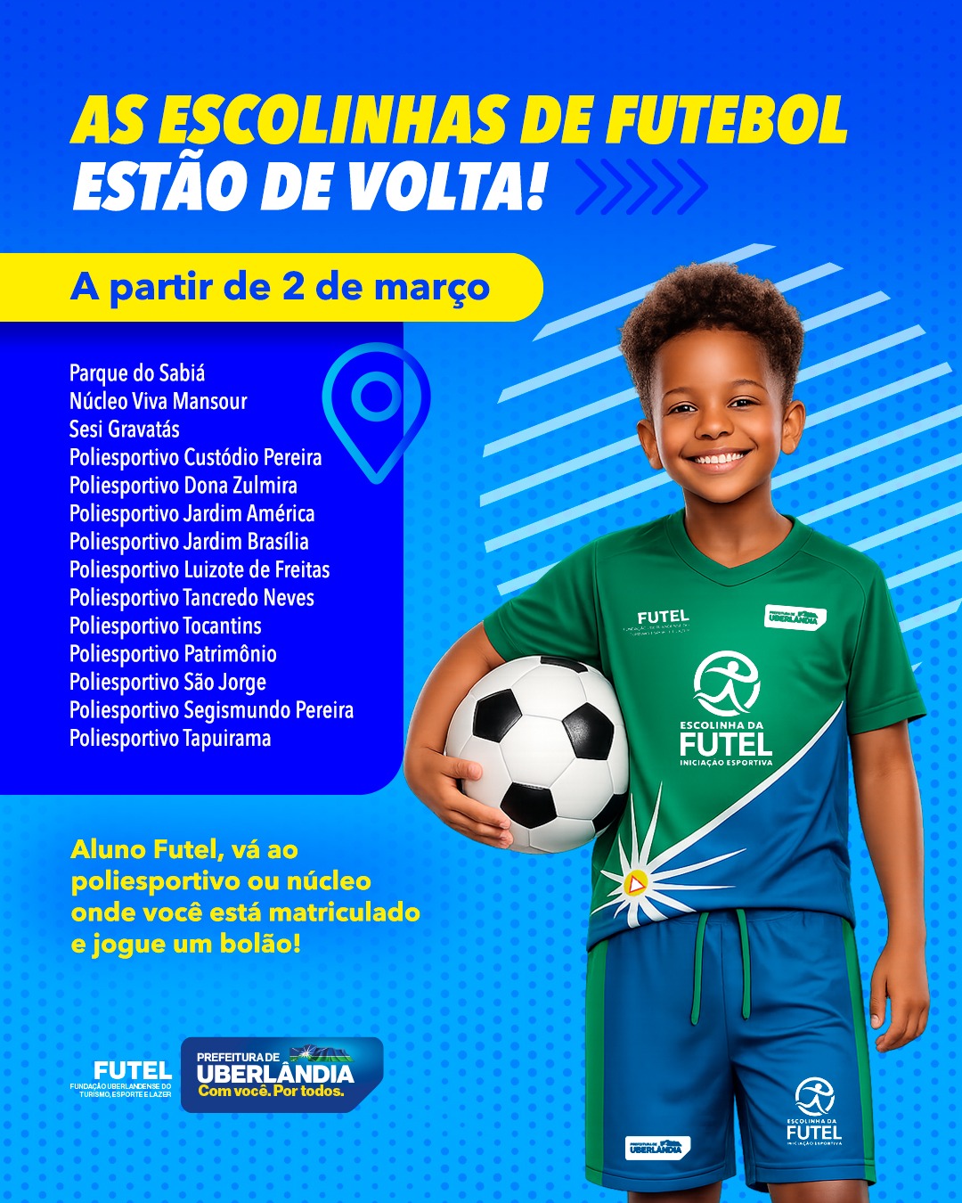 A Prefeitura de Uberlândia inicia, nesta segunda-feira (2), as aulas de iniciação esportiva em futebol nos núcleos e poliesportivos da Fundação Uberlandense do Turismo, Esporte e Lazer (Futel) em 2026. A modalidade é oferecida gratuitamente em 14 locais, abrangendo todas as regiões do município (confira abaixo).