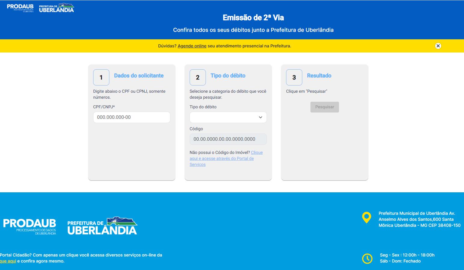 Para aproveitar o benefício dentro do novo prazo, os contribuintes que ainda não efetuaram o pagamento devem emitir a segunda via da guia pelo sistema online da Prefeitura de Uberlândia. O documento pode ser acessado por meio da seção específica no Portal da Prefeitura (clique AQUI) ou pelo Portal do Cidadão. Também é possível solicitar a emissão pelo WhatsApp do Serviço de Informação Municipal (SIM), pelo número (34) 3239-2800.