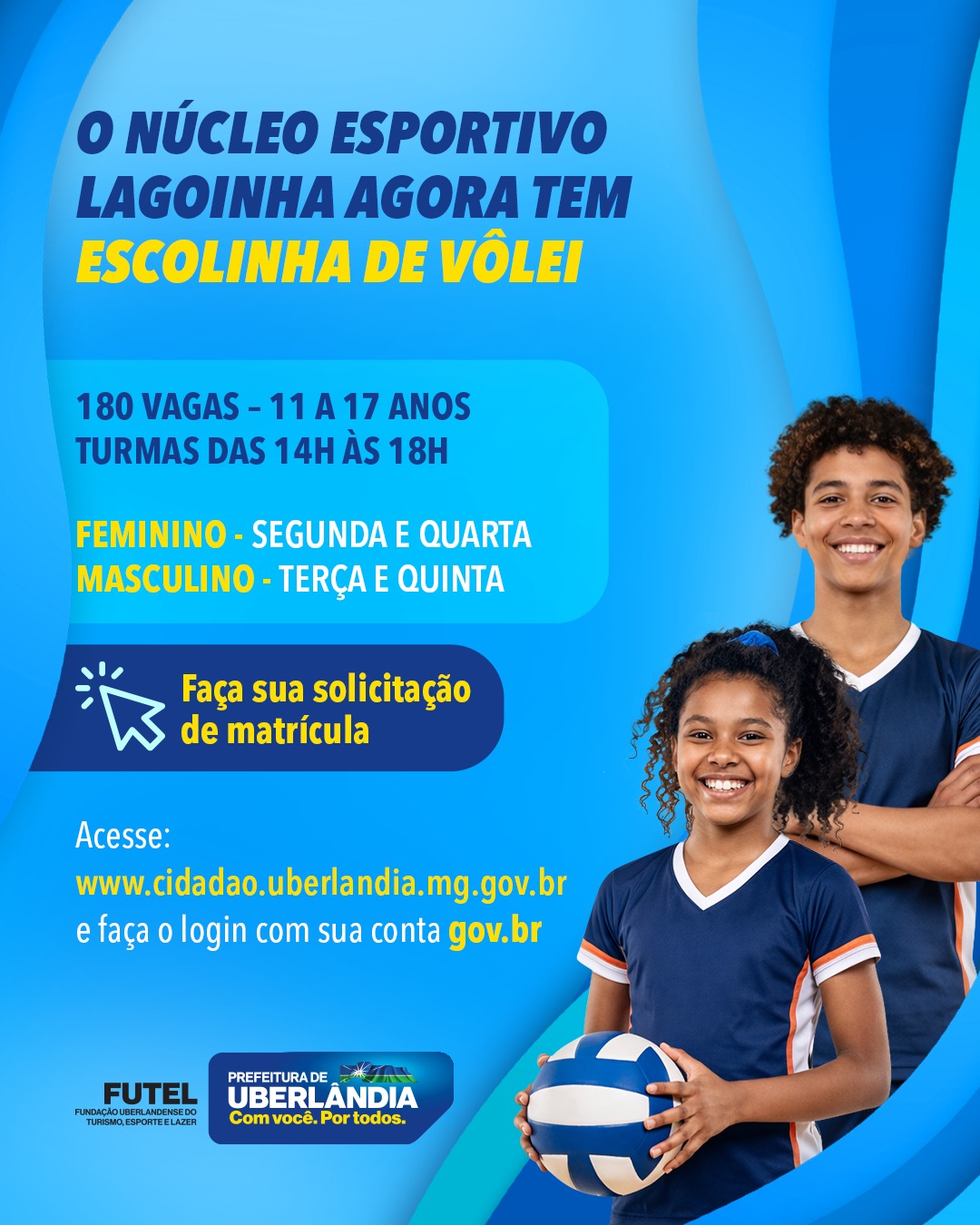 A Prefeitura de Uberlândia, por meio da Fundação Uberlandense do Turismo, Esporte e Lazer (Futel), implantou mais uma modalidade esportiva no Núcleo Lagoinha: o vôlei, com aulas voltadas a crianças e adolescentes com idade de 11 a 17 anos. Foram abertas 180 vagas gratuitas para iniciação esportiva na modalidade, que será oferecida às segundas e quartas (feminino) e às terças e quintas (masculino), das 14h às 18h. A solicitação de matrícula deve ser feita gratuitamente através de sistema on-line, pelo Portal Cidadão, no Portal da Prefeitura (confira o passo a passo abaixo).