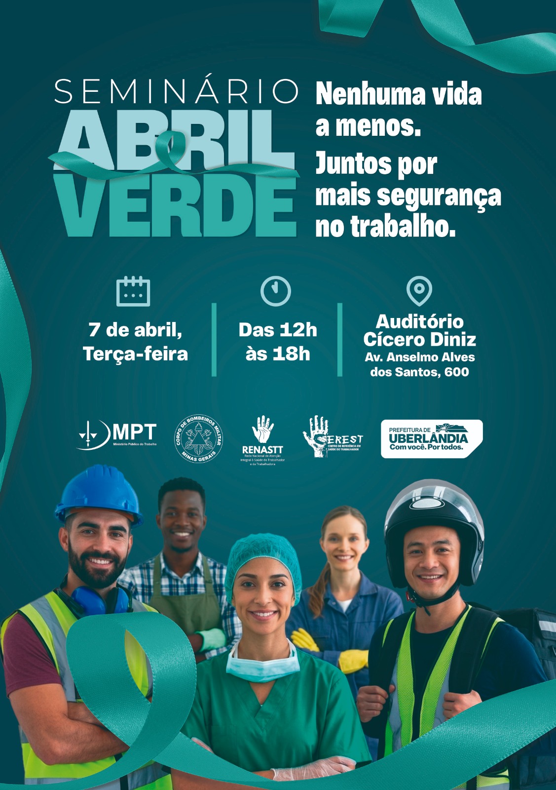 A Prefeitura de Uberlândia, por meio da Secretaria Municipal de Saúde, através do Centro de Referência em Saúde do Trabalhador (Cerest), com apoio do Ministério Público do Trabalho (MPT) e do 5º Batalhão de Bombeiros Militar de Minas Gerais (5º BBMMG), promove, nesta terça-feira (7), o Seminário Abril Verde 2026. A iniciativa integra a campanha nacional de conscientização sobre a prevenção de acidentes e doenças relacionadas ao trabalho. O evento é destinado a servidores públicos, que deverão se inscrever clicando aqui.