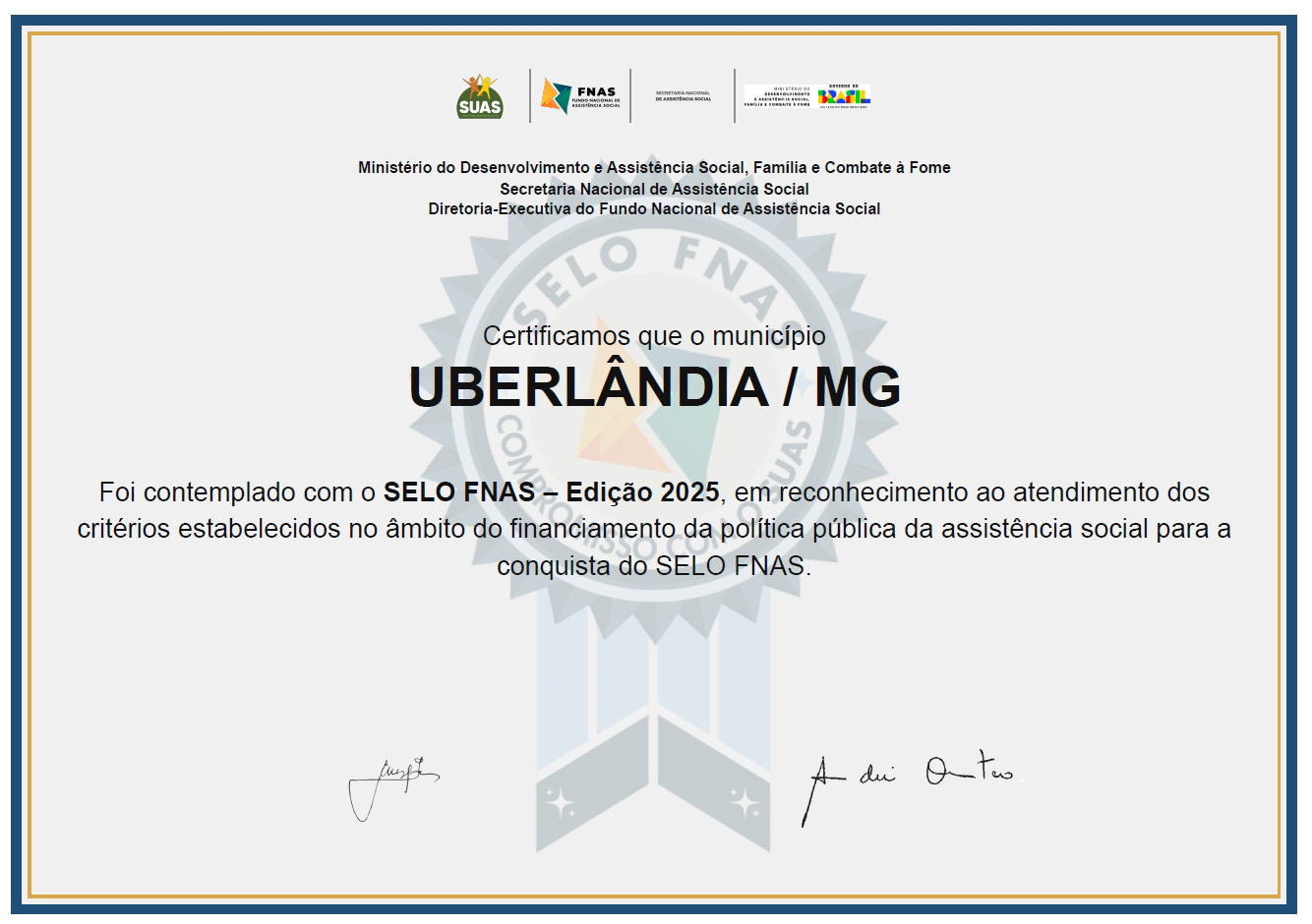 O objetivo do Selo FNAS é certificar os entes que aprimoraram e gerenciaram o orçamento, financiamento e execução de suas políticas de assistência social, qualificando os resultados e a gestão orçamentária, financeira e contábil do Sistema Único de Assistência Social (Suas) em 2025. Na prática, a certificação reforça a credibilidade da Prefeitura de Uberlândia diante dos órgãos federais e amplia suas possibilidades de novos investimentos, contribuindo com a prestação de serviços essenciais voltados às pessoas em situação de vulnerabilidade social.